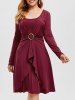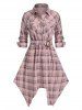 Plus Size Plaid Hanky Hem Belted Pocket Roll Tab Sleeve Dress